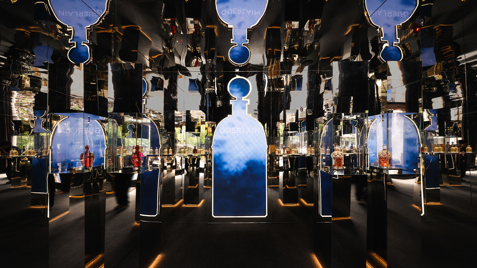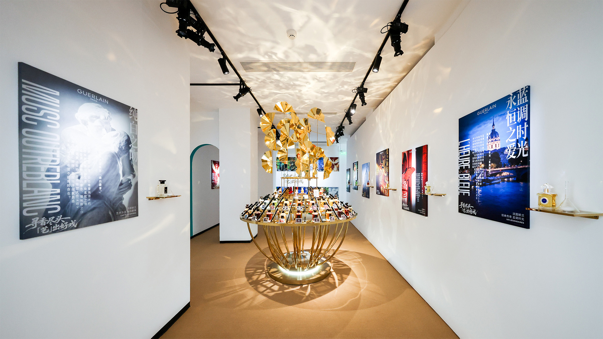 ATOMOS collaborated with Guerlain to create the co-branded "At the End of the Scent, 'Art' Takes the Stage" event for the Wuzhen Theatre Festival . The design blended the wooden tones of ancient architecture with deep blue and gold, symbolizing the borderless nature of art and the symbiosis of fragrance and setting . The event fused the rustic, immersive Eastern charm of a Jiangnan ancient house with the legendary French artistry of Guerlain's Abeille bottle.