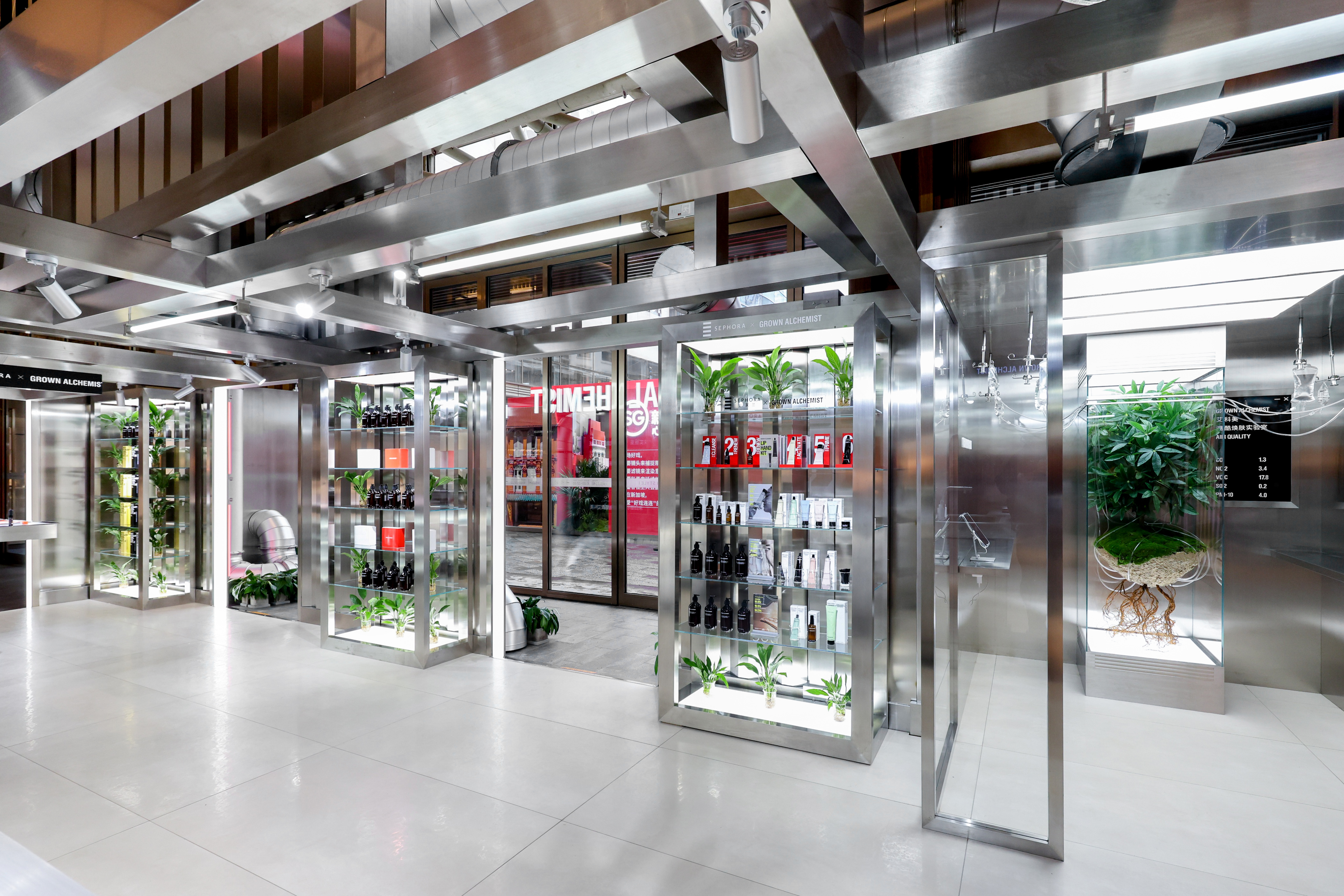Inspired by its signature metallic laboratory aesthetic, the brand transformed the space into a trendy skincare lab.