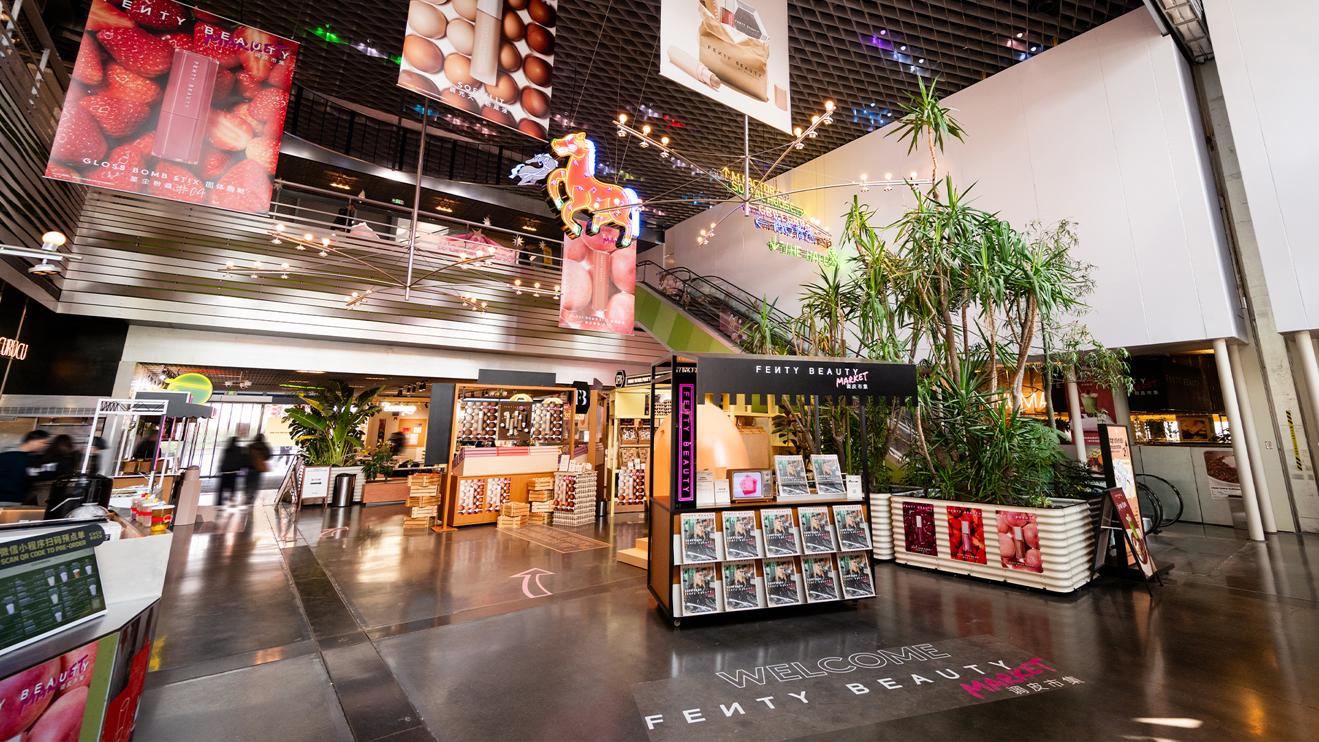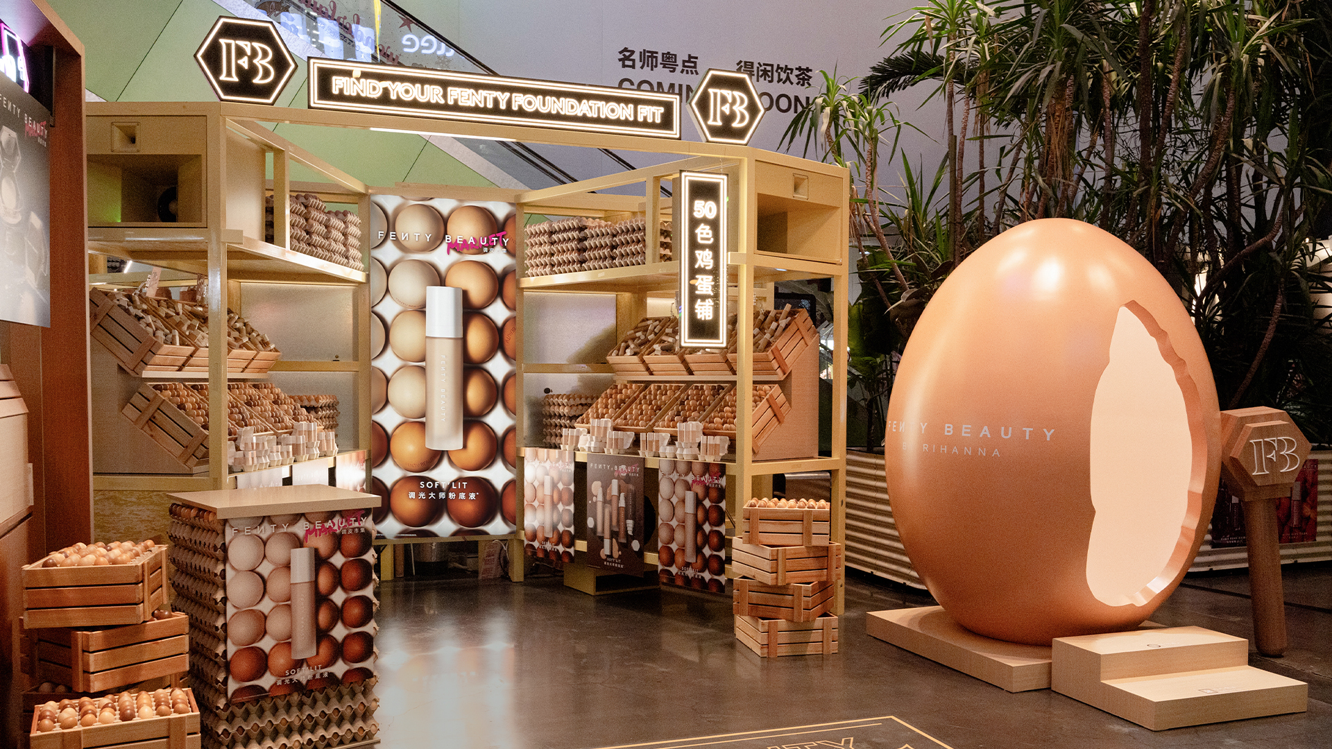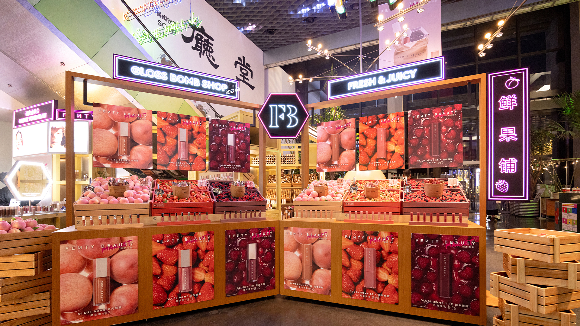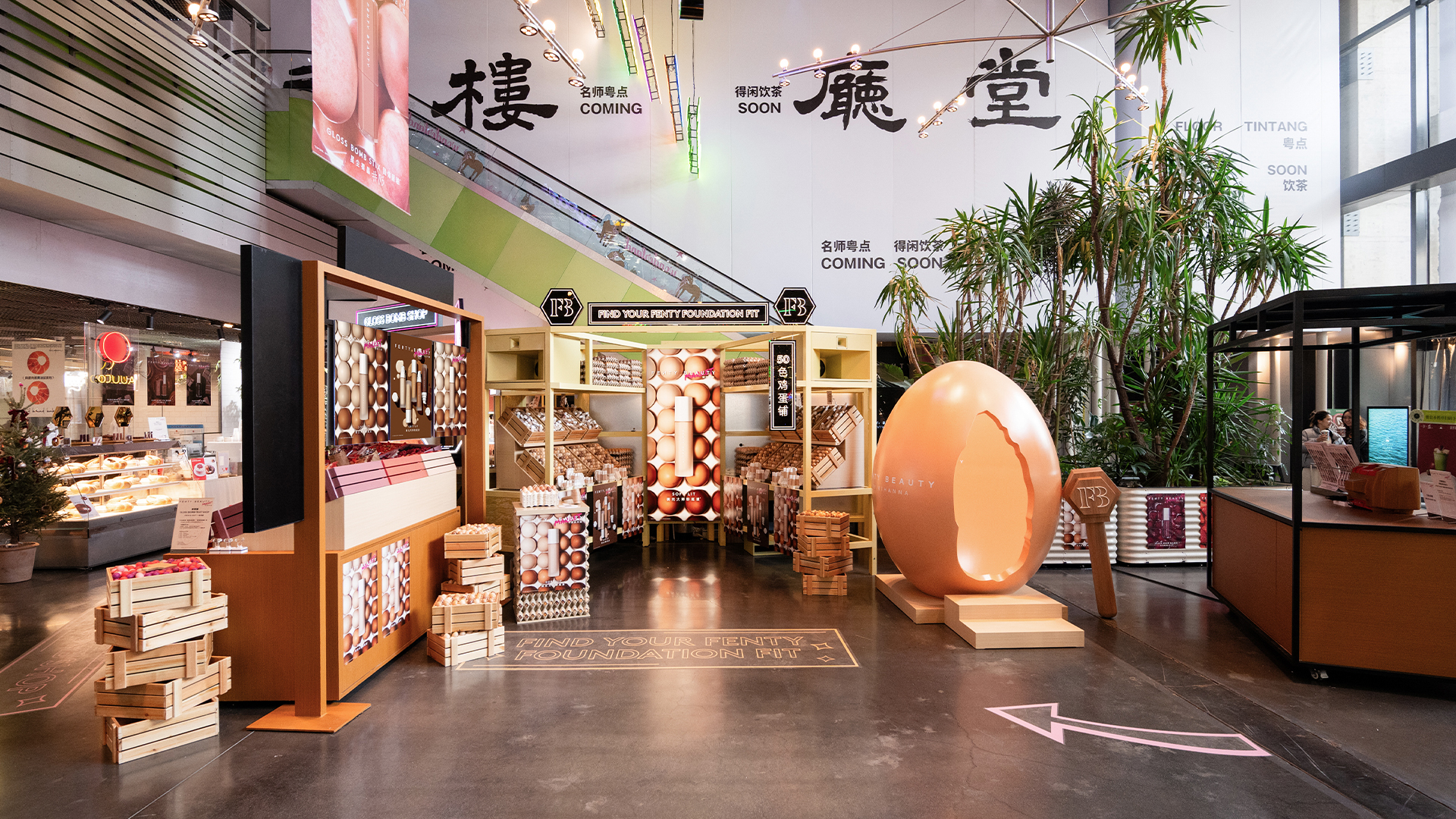 1月15日-1月27日,上海西岸BLOOMARKET,Fenty Beauty本次POP-UP以“调皮市集”为主题打造多元玩妆空间。 现场 50 色鸡蛋铺联动50个色号粉底液,视觉呈现粉底色号多样化;鲜果铺搭配各色唇釉,解锁元气美妆灵感;煎饼摊、 琥珀小吃摊带来生活气息,让彩妆体验融入趣味日常;试妆区提供个性化试妆,全程趣味与福利拉满。超万人次参与,这 场潮流与玩妆的碰撞,打破美妆体验边界,让玩妆快乐与潮流氛围治愈每一位到场者!活动邀请XXOKATE、陈土豆作为一 日店长,现场与粉丝近距离互动,解锁专属玩妆秘籍,众多美妆达人也纷纷到场打卡,引爆潮流氛围。